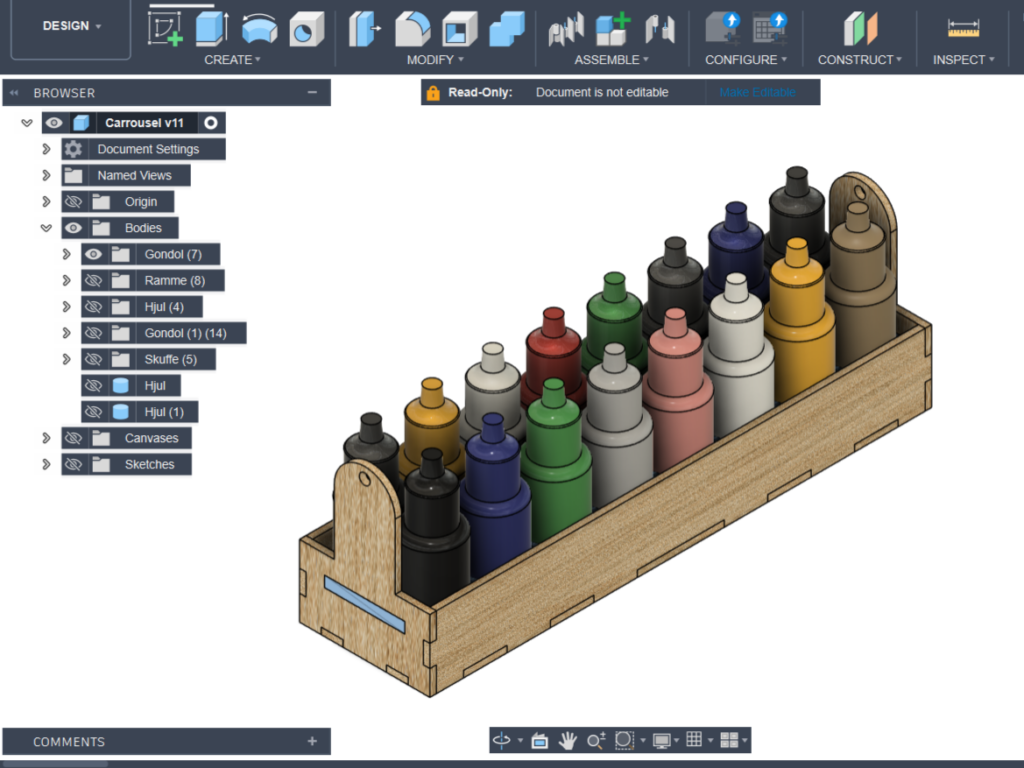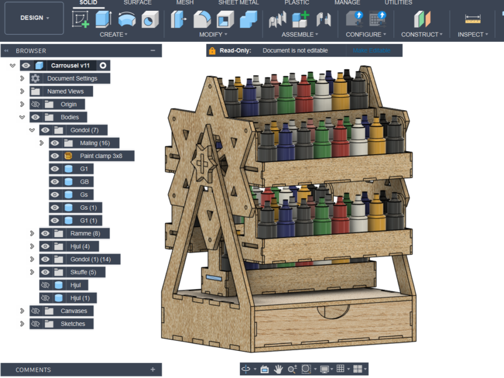 Endnu engang var mine 3D-tegneevner ude pĂ„ dybt vand, hvor jeg ikke kunne bunde. Og endnu engang svĂžmmede jeg alligevel i mĂ„l. Resultatet blev en mĂžlle, der kan holde 96 flasker maling â fordelt pĂ„ seks gondoler, som hver rummer 16 flasker. I bunden gemmer der sig endda en lille skuffe til vĂŠrktĂžj, pensler, rystekugler og alt det andet smĂ„nips, man bruger sammen med malingen.