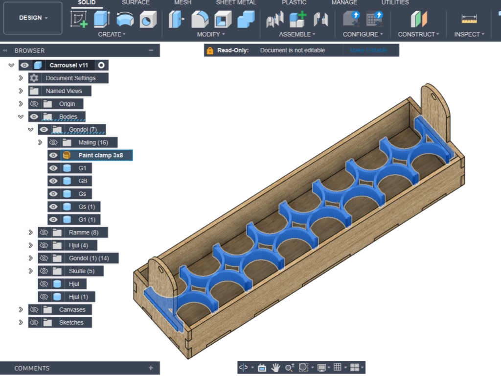 Det snedige ved designet er kombinationen af 3D-print og laserskÊring. Selve gondolerne er laserskÄret i MDF, mens holderne, der griber omkring flaskerne, er 3D-printede, sÄ de kan udnytte plastens elasticitet. Det fungerer overraskende godt.