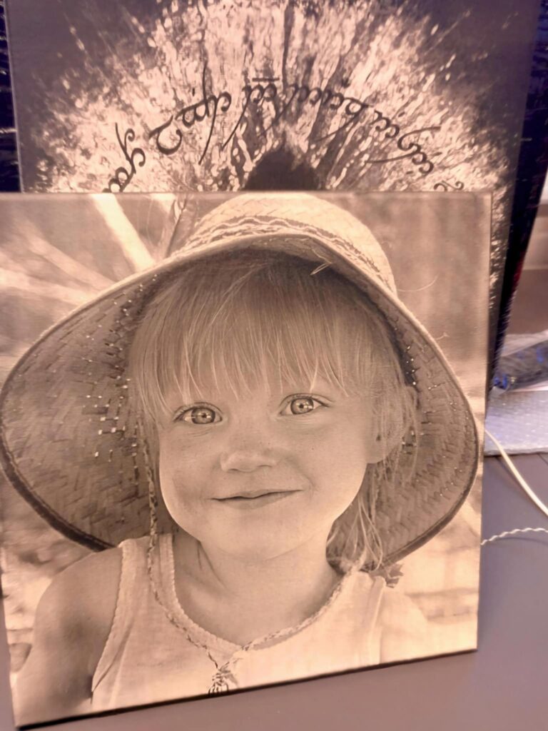 Det tog en del forsÞg, men hver iteration blev bedre og bedre. Kombinationen af farvelag, laserstyrke og det rigtige billede kan skabe nogle virkelig flotte kunstvÊrker. De fÄr en rÄ, nÊsten grafisk kvalitet, der stÄr skarpt mod lÊrredets struktur. PortrÊtter fungerer isÊr godt, og nÄr det lykkes, opstÄr der en slags digital-analog magi, som er helt sin egen.