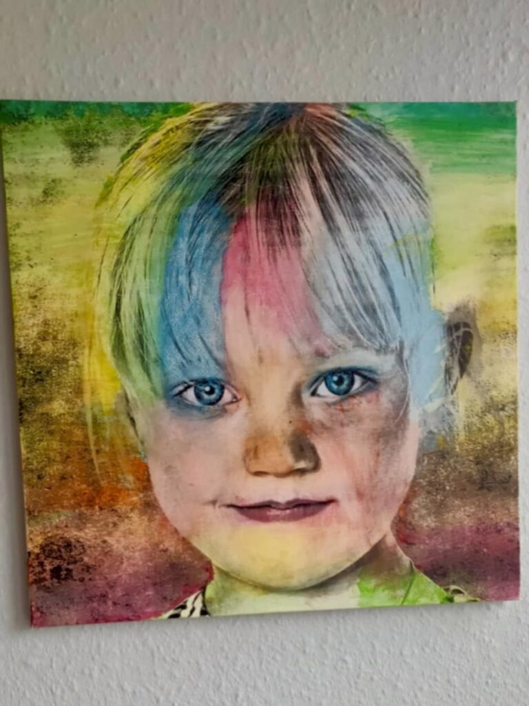 PĂ„ et af billederne af Ida skete der noget helt sĂŠrligt. Ida, tre Ă„r gammel og fuld af gĂ„pĂ„mod, insisterede pĂ„ selv at male billedet. Hun ville vĂŠre med â ikke bare kigge. Og jeg overgav mig. Det viste sig at vĂŠre en af de bedste beslutninger i hele projektet.