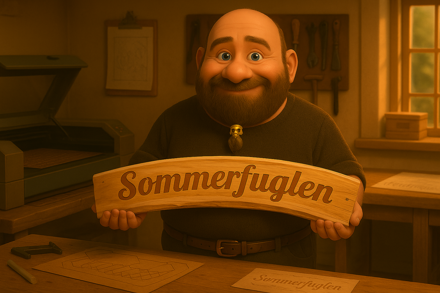 Mormor havde fundet en helt særlig planke: flot, levende træ med en naturlig bue, som nærmest bad om at blive lavet til et skilt. Hun spurgte, om jeg kunne gravere “Sommerfuglen” på den – og den slags opgave får man kun én chance for at gøre rigtigt.