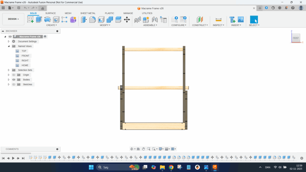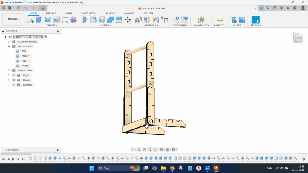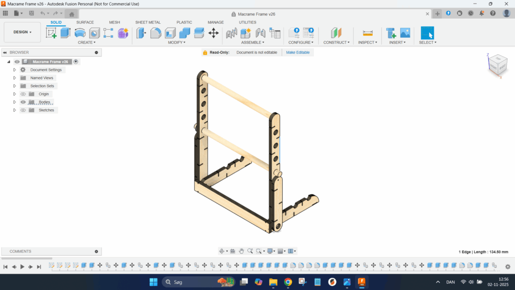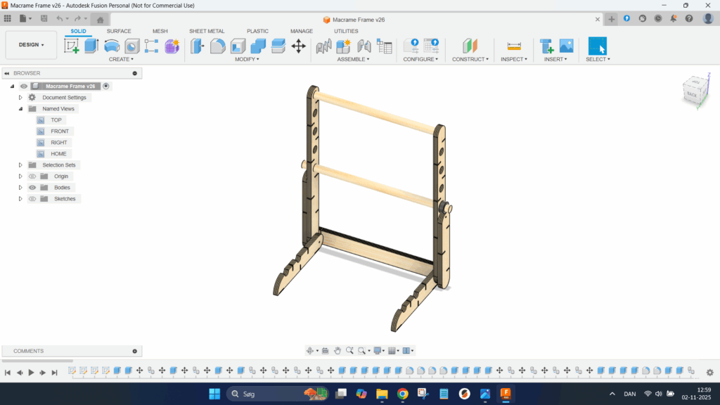 Så jeg kastede mig ud i at designe en fuld ramme i lasercutteren. Det krævede, at jeg fik udfordret mine Fusion 360-evner (et 3D-designprogram, som jeg stadig kun kradser i overfladen af – jeg er absolut amatør, men jeg får tingene til at virke 😉).