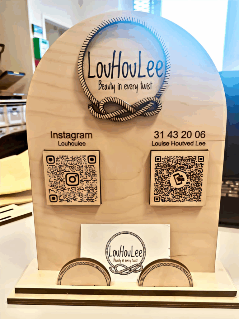 Derfor designede jeg en laserskåret visitkortholder i birkefiner – med hendes logo, hendes Instagram-handle og både Instagram QR-kode og MobilePay QR-kode integreret direkte i fronten.
